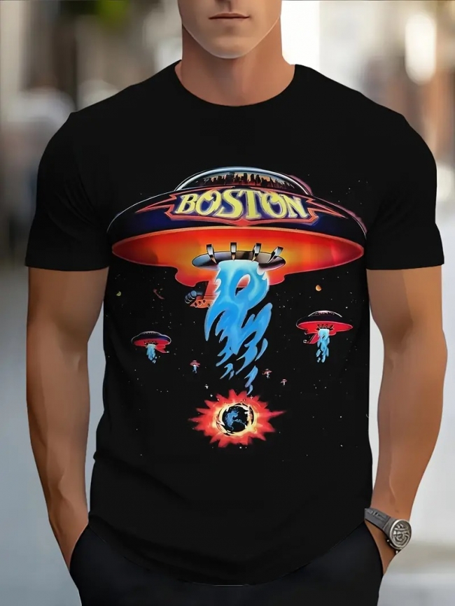 Camiseta gráfica de rock de Boston para hombre - Diseño de cartel de concierto psicodélico, camiseta casual de cuello redondo negra con estampado de naranja y azul brillante, tejido ligeramente elástico cómodo para ropa casual.