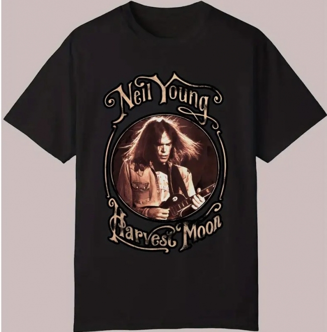 Camiseta Gráfica Vintage de Neil Young "Harvest Moon" para Hombres - Poliéster Transpirable, Camiseta Retro para Fans de Neil Young, Ajuste Clásico Lavable a Máquina, Ideal para Festivales y Looks Casuales, Estampado Vibrante, Cuello Redondo, Manga Corta, Material Duradero, Ropa Casual, Adultos