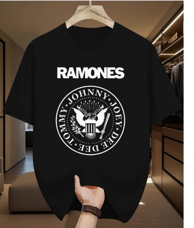 Camiseta casual de manga corta con estampado gráfico de Johnnie Ramones - Diseño de logotipo de banda negra y blanca, ajuste regular, camiseta de verano para ocio al aire libre y atuendo casual, ropa de fanático de la música | Cuello redondo, tejido transpirable, camisetas de concierto