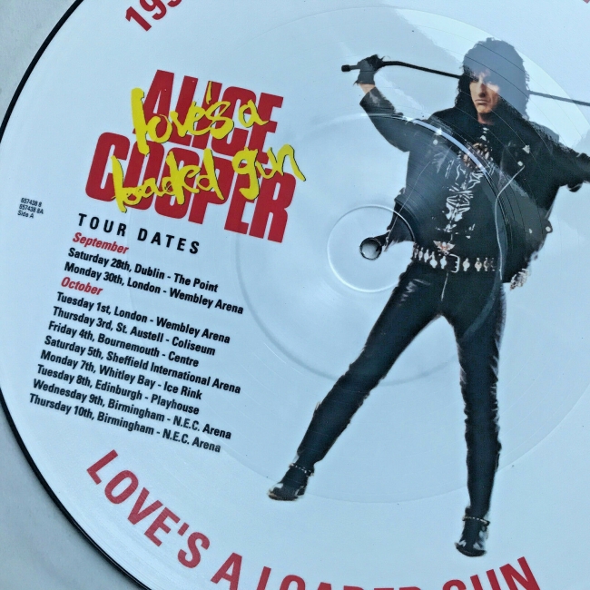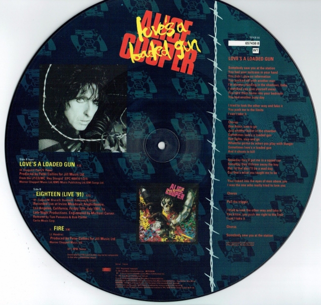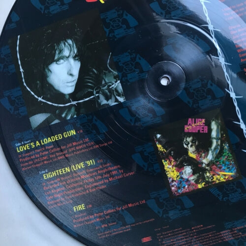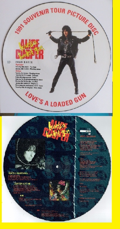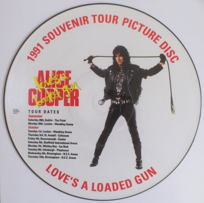 ALICE COOPER Loves A Loaded Gun (1991 UK Limited Tour Souvenir Edition 3-track 12"" Picture Disc featuring the UK Sept/Oct tour dates and title track lyrics also including Eighteen [Live 91] and Fire housed in clear PVC sleeve)