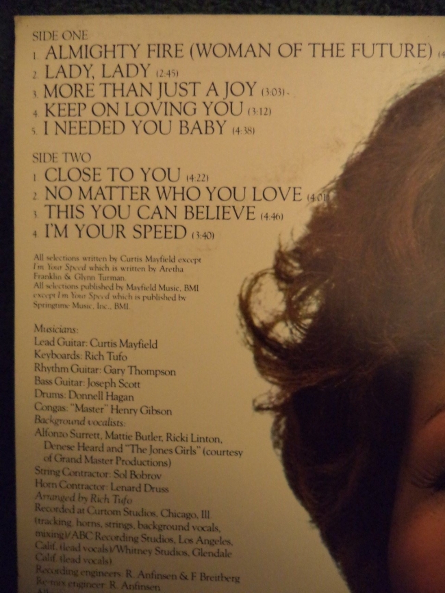 Almight Fire fue grabado en 1978, el productor Curtis Mayfield logra buenos momentos en este álbum. ¡Aretha hace algunas calistenias vocales absolutamente imposibles en la canción principal, y Mayfield toca este solo de guitarra realmente genial en 'This You Can Believe', que suena desde principios de Funkadellic! 'I'm Your Speed' también es genial. Es una desviación del ritmo de baile de los álbumes, una balada lenta y dulce que, de nuevo, tiene a Aretha haciendo algunos trucos vocales de 'Cómo diablos hace eso'. Aretha le debe un gran agradecimiento a Curtis Mayfield por tener buen sentido en los controles. Un productor no tan moderno como Curtis podría haber hecho de este álbum un desastre.