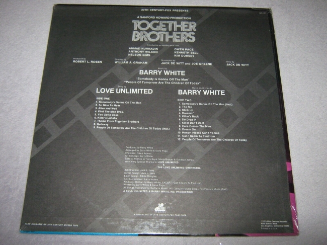 ultra raro albun que fuen una banda sonara DE LLAMADO Blaxploitation, compuesta por barry white ...junto con el maestro las orquestaciones densas, perfectas e imponentes ! en Together Brothers, White aplica su habilidad ilimitada a un funk duro que generalmente no asociamos con su música. Es fascinante escuchar el enfoque gigante y wagneriano de White aplicado a líneas de bajo gruesas y riffs de conducción.