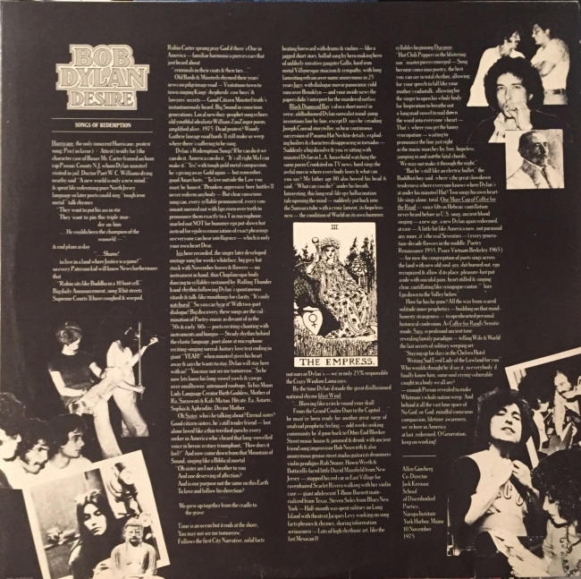 Su vertiente más zíngara es la recogida en “Desire” (Hard Rain aparte). Para muchos es simplemente el álbum de ‘Hurricane’, para mí significa mi primer encuentro con Bob, imaginen. “Desire” es la versión en disco de la Rolling Thunder Revue, esa caravana de personajes de diverso pelaje con la que Bob se recorrió todo Estados Unidos. Marcado por el violín de Scarlett Rivera contiene dos de mis canciones “menores” favoritas de toda su carrera: ‘One More cup of Coffee’ y ‘Romance in Durango’, con unos eróticos coros de Emmylou Harris en castellano.