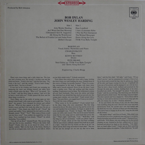 A Dylan lo habían abucheado hasta hartarse por dar conciertos eléctricos con THE BAND. Se había roto el cuello montando en moto. Y mientras se reponía se había ocultado en un sótano de Woodstock con sus colegas para grabar las maquetas una serie de canciones absolutamente extravagantes de puro tradicional, o no tanto ("The Basement Tapes"). Ninguna de esas canciones apareció después en "John Wesley Harding". En su lugar, con retórica bíblica y música concisa (aunque alguna canción de amor profano también hay), publicó una serie de breves relatos de ambiente rural y arcaico, muchos de ellos aparentemente simples, intranscendentes y auto-conclusivos. Exactamente como los "haikus" japoneses: puro Zen. Así que te dejaban más intrigado, más confuso y viéndole más vueltas a estas letras, más significados ocultos, más claves metafísicas que a todos aquellos poéticos delirios de "Bringing It All Back Home", "Highway 61 Revisited" o "Blonde On Blonde". Y ya no te cuento si una de las canciones te animaba a "no hablar con falsedad" porque "se nos echa la hora encima" "All Along The Watchover"). Y otra ("Frankie Lee and Judas Priest") te explica su propia moraleja, nada más y nada menos: "que uno no debe estar donde no le corresponde", y "no vayas confundiendo el Paraíso con una casa (de putas, por supuesto) que hay al final de la carretera". Y el acabose: en otra a Dylan le daba pena un pobre inmigrante, pero éste resulta que es un perfecto cretino: entonces, ¿le da pena por inmigrante o por mala persona?.