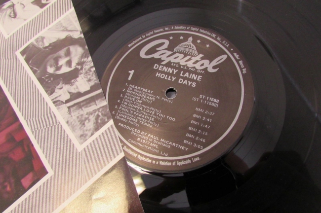 DENNY LAINE - HOLLY DAYS. Former member of Wings. Produced by Paul McCartney. Capitol ST-11588 stereo LP record album. Released 1977. Condition: Record is mint. Cover is VG++ with factory corner punch. Contains original inner sleeve with photographs by Linda McCartney