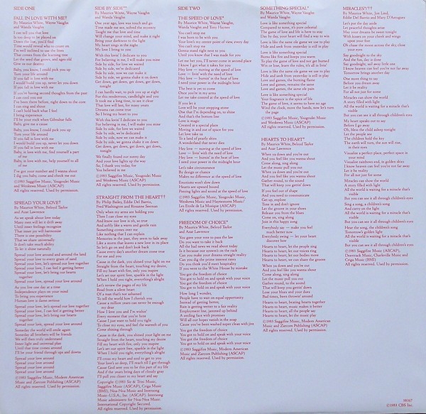 Este es en gran medida un álbum sobre uno de sus temas universales, Amor, y su poder para cambiar actitudes, percepciones y llevar a las personas a una gran comprensión mutua. Canciones como 'Enamórate de mí'; 'Difundir tu amor'; 'Lado a lado'; 'The Speed Of Love' y 'Something Special' tienen un doble significado si uno escucha las letras con comprensión. No es solo físico o mental, sino también amor espiritual por uno mismo y por los demás. La joya de la corona de este tema y el álbum, en mi humilde opinión, es 'Milagros'. Una hermosa canción sobre la vida, el amor, la esperanza, los sueños y tiene los arreglos vocales más bellos que jamás haya escuchado.
