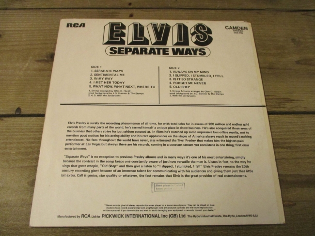 Los primeros cinco lados son impecables (pistas 1 - 5) y le dan al álbum la sensación de una especie de álbum conceptual: el rey cantando sobre el amor perdido. Separate Ways es una canción maravillosa, en mi opinión la mejor del disco. Por supuesto, el gran éxito fue Always on my Mind y Elvis ofrece una lectura impresionante de esta canción