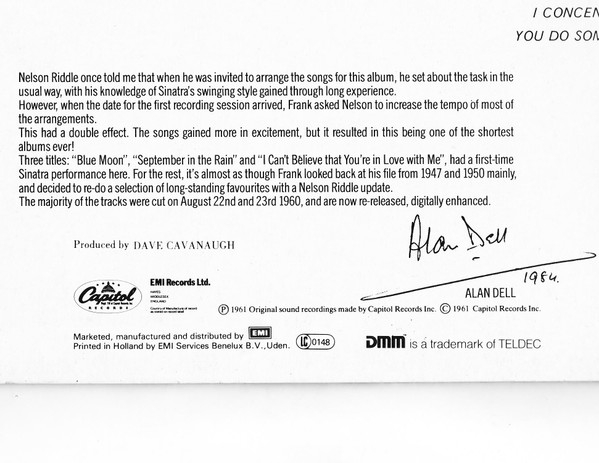este albun muestra al cantante en la cima de sus habilidades vocales e interpretativas. Los arreglos de Nelson Riddle de estándares como "Blue Moon" de Rodgers y Hart, "Always" de Irving Berlin y "You Do Something to Me" de Cole Porter dejarían a la mayoría de los vocalistas en el polvo, pero Sinatra los domina sin siquiera sudar la gota gorda