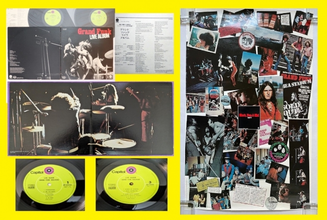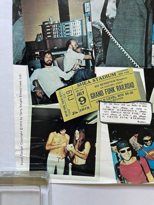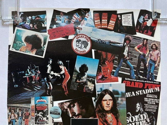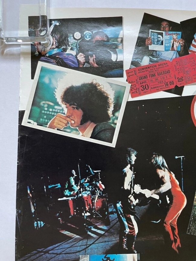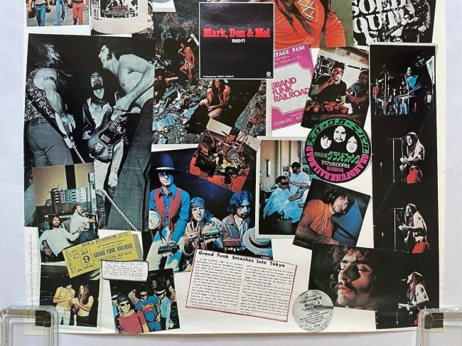 Este póster presenta un collage de imágenes de Grand Funk Railroad de 1969 a 1971. Incluye varias fotos de los miembros de la banda, entradas de conciertos y material promocional de esa época. El póster también contiene breves textos relacionados con las actividades de la banda durante esos años, como su actuación en Tokio.
