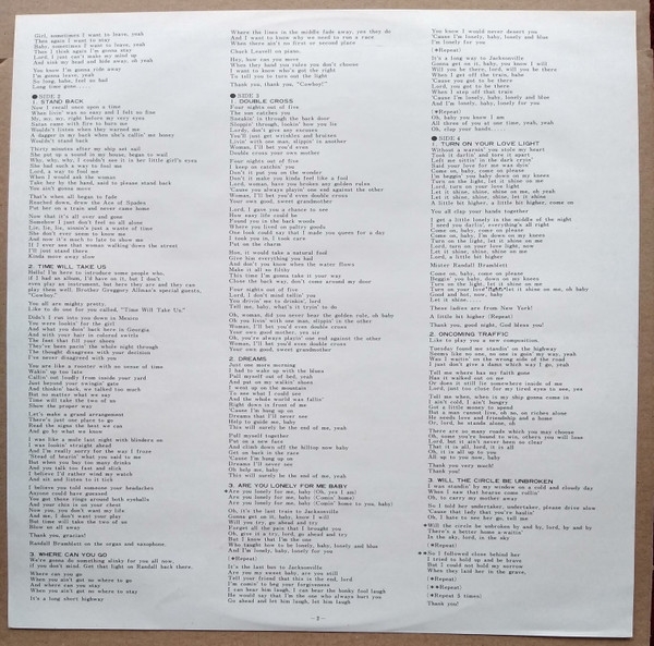 tambien esta arropado y de que modo por una gran orquesta con 24 miembros que envuelven sus temas como nunca los habiamos escuchado antes,, para mi esta albun es toda una obra maestra del sureño y mucho mas..gregg entaba en la cima abriendo su carrera en solitariuo presentando temas que ya son historia de su repertorio..,