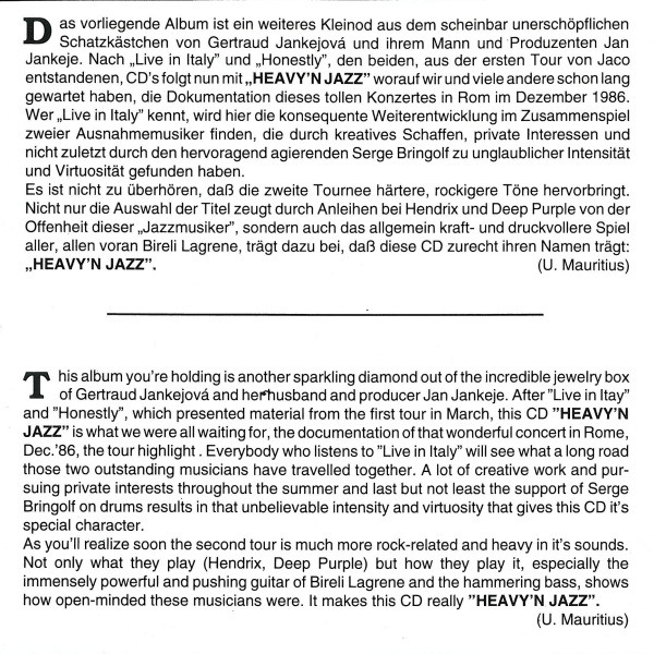 Jaco ha recorrido un largo camino desde Weather Report, y Bireli ha dejado de lado su distorsión acústica y agregada. Las canciones de este álbum varían desde entrenamientos de jazz hasta versiones de Purple Haze y Hendrix. Creo que la mejor manera de clasificar este álbum sería como jazz con una sensibilidad de metal.