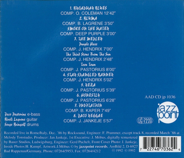 Directo impresionante. La guitarra de Bireli Lagrene con ese toque heavy y con Jaco, es de lo más brutal. El tema 3 The Medley con el clásico Teen Town es extraordinario. Recomendado 100%.