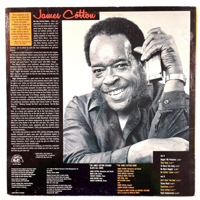 la mitad del set coloca a Cotton en un entorno tradicional junto al guitarrista Magic Slim, el pianista Pinetop Perkins y una sólida sección rítmica; la otra mitad lo empareja con un combo contemporáneo con los rápidos lamidos del guitarrista Michael Coleman y una sección de vientos de tres piezas. Ambas combinaciones hacen clic en todos los quemadores. High Compression incluye el tema musical abrasador "Superharp".