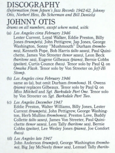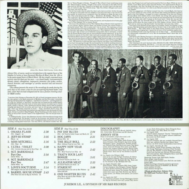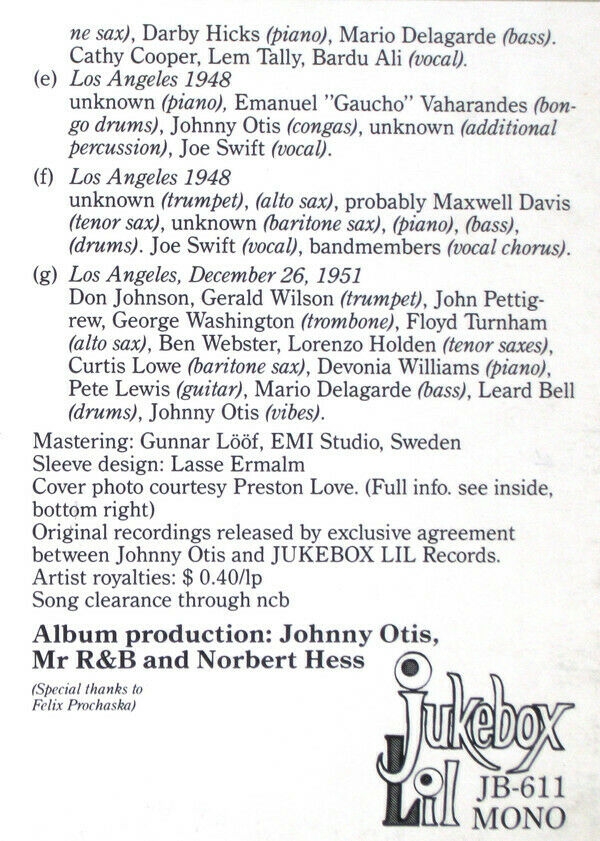 estupendo albun del gran johnny otis, dicen que el invento el Rhythm & Blues con sus bandas llenas de legendarios musicos, no olvidemos que su hijo es uno de los mejores guitarars de todos los tiempos, suggie otis que tambien grabo con a partir de los 70