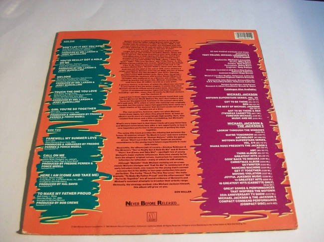 MICHAEL JACKSON en solitario, con canciones que fueron grabadas entre 1973 y 1975 pero que la Motown Records no publicó hasta 1984, tras el enorme éxito del álbum Thriller con Epic Records.