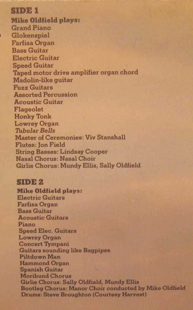 Composed by Mike Oldfield (except "Sailors Hornpipe" traditional) CREDITSMIKE OLDFIELD -- grand piano, glokenspiel, Farsifa organ, bass guitar, electric guitars, speed guitar, taped motor drive amplifier organ chord, mandolin-like guitar, fuzz guitars, assorted percussion, acoustic guitar, flageolet, honky tonk, Lowre organ, tubular bells, speed electric guitars, piano, concert tympani, guitars sounding like bagpipes, piltdown man, Hammond organ, Spanish guitar, moribund chorus