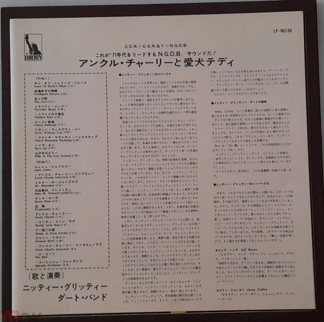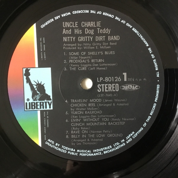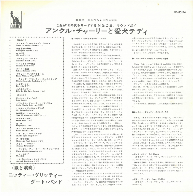 Charlie & His Dog Teddy (BGO Records). Nitty Gritty Dirt Band es uno de los grupos pioneros en promover la fusión de los sonidos campestres norteamericanos con el rock. Fruto de esta labor es este álbum grabado en 1970 por el entonces quinteto de jóvenes músicos con residencia en California, quienes no dudan en mezclar los instrumentos eléctricos con otros más tradicionales (violín, mandolina, banjo, acordeón y armónica). El country rock, el folk, pop, blues, bluegrass e incluso el flamenco están presente en el amplio repertorio del álbum, donde se incluyen composiciones de Michael Nesmith, ex-Monkee, Kenny Loggins, Jerry Jeff Walker, Randy Newman Earl Scruggs y Norman Petty, entre otros autores. Del tercero se recogió la inolvidable y popular Mr. Bojangles, una pieza que adquiere nuevas sonoridades al ser interpretada por The Nitty Gritty, cuyos miembros también trataron de realzar las raíces de la música de Estados Unidos con alguna composición tradicional como la titulada Jessie James. La carpeta del disco fue diseñada por Dean O. Torrence/Kittyhawk Graphis, y en la portada ofrece una fotografía de William E. McEuen.