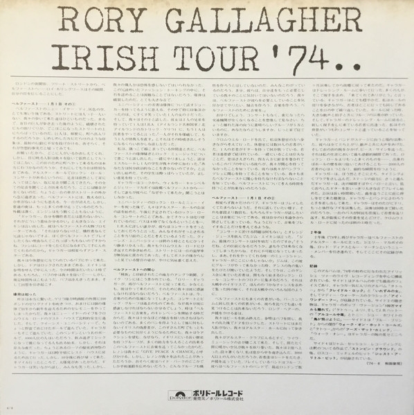 rish Tour '74 es el segundo álbum en vivo del guitarrista irlandés de blues rock Rory Gallagher, publicado en 1974 por Polydor Records. Como su nombre lo indica fue grabado en la Isla de Irlanda durante el mes de enero del mismo año en los recintos Ulster Hall de Belfast en Irlanda del Norte, el Carlton Cinema de Dublín y el City Hall en Cork, estos dos últimos en Irlanda.1