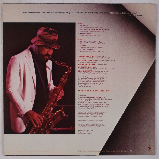 No hace falta decir que después de una inspiradora cabalgata de sonido como Don't Ask anything sonny Rollins sacó estaba destinado a sonar bastante suave, no es que el álbum anterior fuera del espacio exterior ni nada: simplemente muy frenético. Teniendo en cuenta su amor mutuo por los sabores rítmicos caribeños, Rollins nuevamente se une a George Duke en este álbum. Y por primera vez en una sesión de Rollins, George trae consigo a su bajista principal, Stanley Clarke.