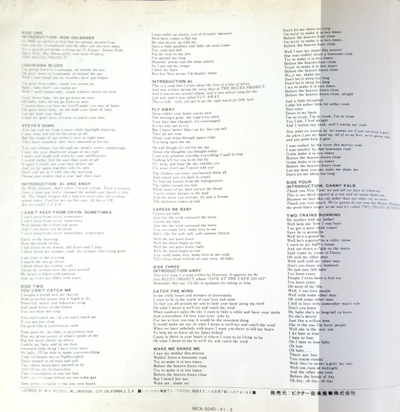 Percussion, Harp - Steve Katz B4 Caress Me Baby7:36 Lead Vocals - Danny Kalb C1 Introduction: Andy0:35 C2 Catch The Wind4:22 Lead Vocals - Steve Katz C3 (I Heard Her Say) Wake Me Shake Me9:11 Lead Vocals - Al Kooper D1 Introduction: Danny Kalb1:00 D2 Two Trains Running13:30 Lead Vocals - Danny Kalb CreditsBass - Andy Kulberg