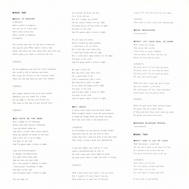 Roger Bush: acoustic bass, acoustic guitar (overdubbed) on "Orange Blossom Special", lead vocal on "Don't Let Your Deal Go Down"