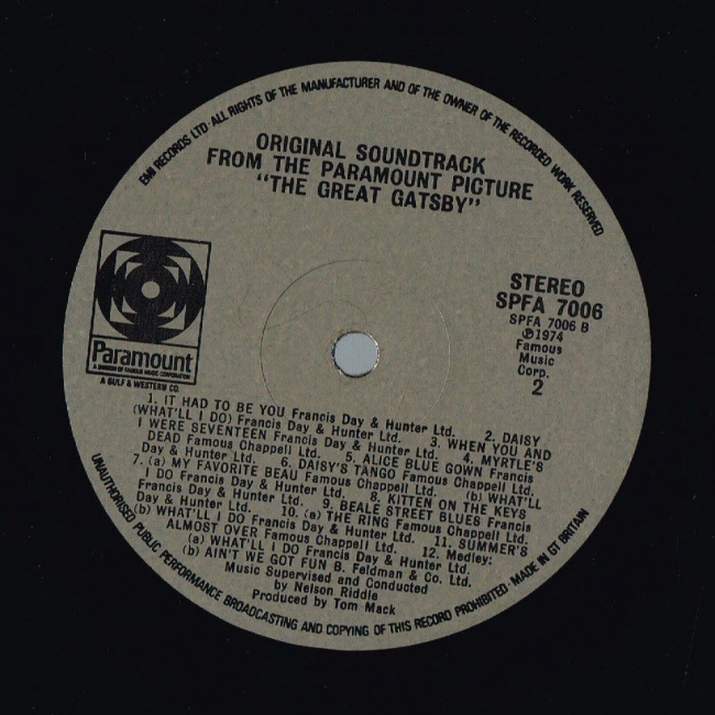 La banda sonora (BSO) de la película El gran Gatsby de 1974, protagonizada por Robert Redford, fue supervisada, adaptada y dirigida por Nelson Riddle. Ganó el Premio Óscar a la Mejor Orquestación: Música Original y Adaptación en 1975.