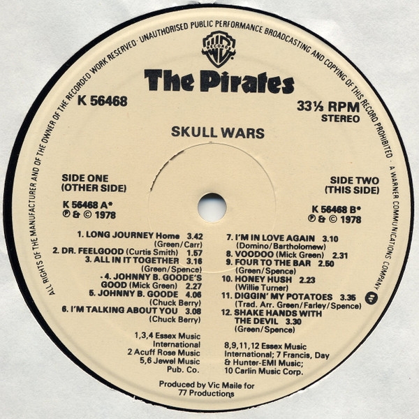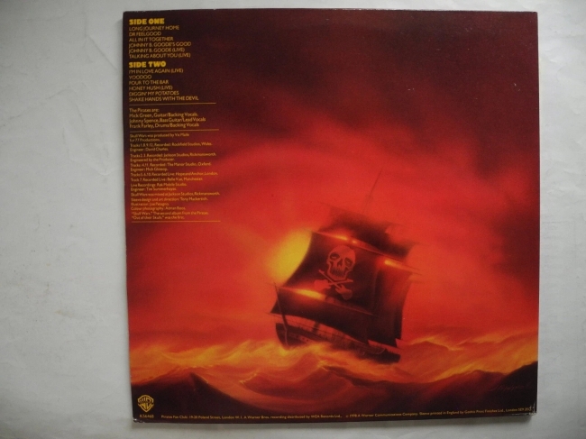 En el 66 Johnny Kidd se vio de nuevo sin banda desperdigandose cada uno de sus miembro hacia diversas banda ,pero a estas alturas Spence y Farley se habian hecho con los derechos de autor del nombre The pirates, asi que Kidd se estrujo el coco y decidio que su nueva banda de acompañamiento se llamarian The new pirates, pero no le duro mucho al bueno de Kidd, al encontrarse con la muerte en la carretera ese mismo año . En el 76 deciden reunirse como pirates para dar unos conciertos y recordar viejos tiempos (en ese mismo año estan girando por los UK los Heartbreakers, ¿coincidencia?), arrasando en la pocas actuaciones que dan, como podeis comprobar no son unos niñatos poco experimentados como los Sex Pistols o los Dammed, y por lo tanto no se trata del punk rasca rasca ,este trio tiene una larga experiencia . Tal fue el exito de los conciertos dados que no fue de extrañar que no les falto tiempo para que la Warner, los fichara ante el tsunami punk que se habia instalado en todo el jodido mundo, demandando nuevos grupos .