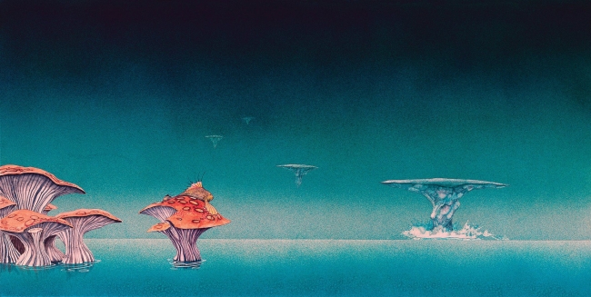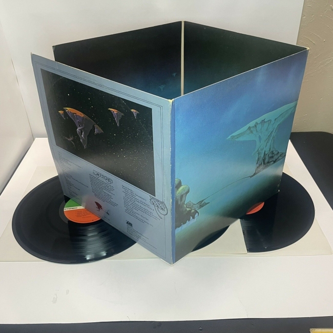 SENSACIONAL TRIPLE CARPETA DESPEGABLE Y EXTENSIBLE ILUSTRADA POR DEL MITICO ROGER DEAN QUE FUE SU DIBUJANTE DE CABAZERA QUIEN ILUSTRO LA MALLORIA DE TODOS SUS DISCOS, PRACTICAMENTE UN MIEMBROS MAS DE LA BANDA.